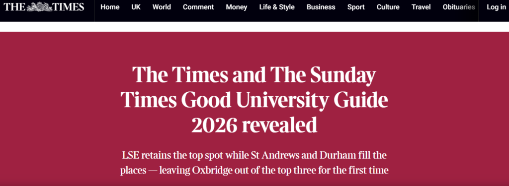 Press review about the Times and The Sunday Times Good University Guide 2026 (national ranking):