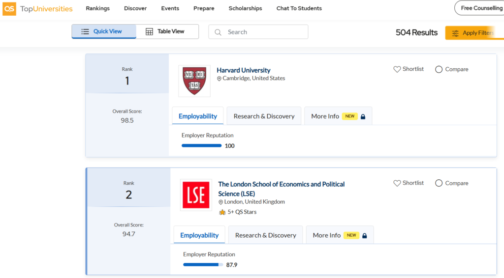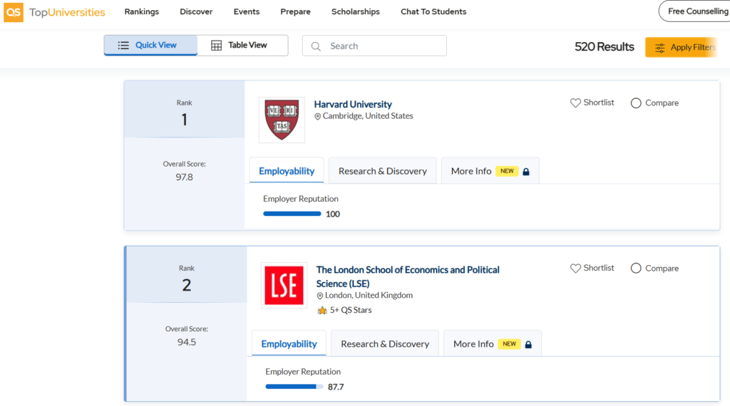 The LSE has been ranked as the best university in the world for Social Sciences & Management after Harvard University for many years by QS.