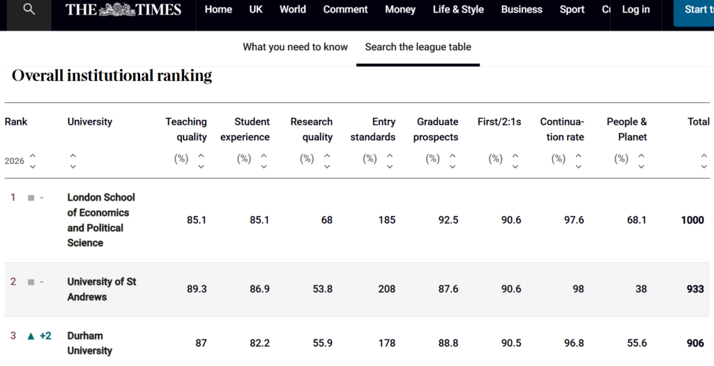 UK University Rankings 2026: League table